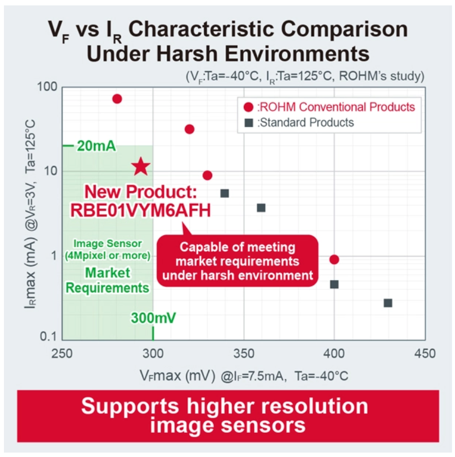 ROHM has developed an innovative Schottky barrier diode that overcomes the traditional VF / IR trade-off. This way, it delivers high reliability protection for a wide range of high-resolution image sensor applications, including ADAS cameras.