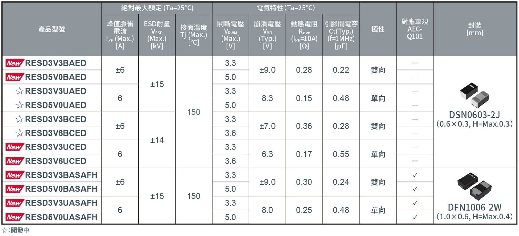 上述優勢有助提高各種高速資料通訊設備(例如AI伺服器和5G/6G通訊設備等工業設備,筆記型電腦和遊戲機等消費性電子產品)的可靠性。另外DFN1006-2W封裝的「RESDxVxBASAFH」和「RESDxVxUASAFH」符合汽車電子產品可靠性標準AEC-Q101的規範,亦適用於導入SerDes*5通訊的ADAS(先進駕駛輔助系統)、AD(自動駕駛)攝影機以及ECU(電子控制單元)等應用。
