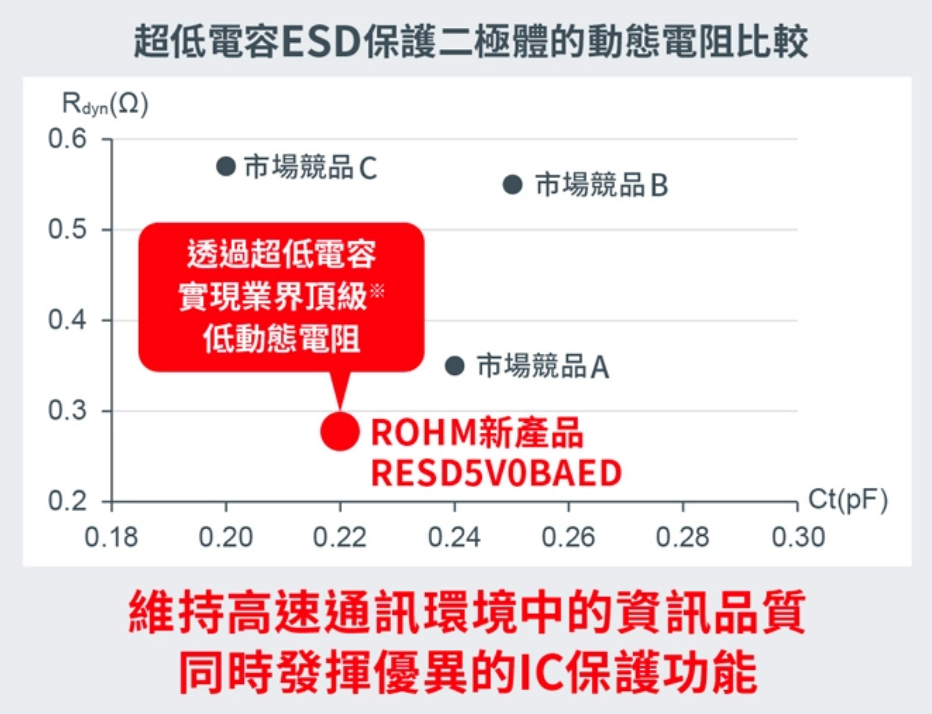 近年來在工業設備和車載市場,高速訊號傳輸的普及與電子設備的小型化、高性能化趨勢日益顯著,系統(電路板、模組)層面對所需的ESD防護措施也要求越來越嚴苛。另一方面,隨著多功能化、高性能化、微細化技術的發展,IC對電氣超載(EOS)和靜電放電(ESD)的耐受能力呈下降趨勢。因此對於兼具「低電容(抑制高速通訊時的訊號劣化)」和「憑藉低動態電阻實現出色IC保護性能」的外接ESD保護元件需求與日俱增。尤其是在10Gbps以上的次世代通訊中,微小的寄生電容差異都可能會對通訊波形產生重大影響。然而,兼同時確保低寄生電容與動態電阻極為困難,因此如何兼顧通訊品質和IC保護,成為亟待解決的課題。
