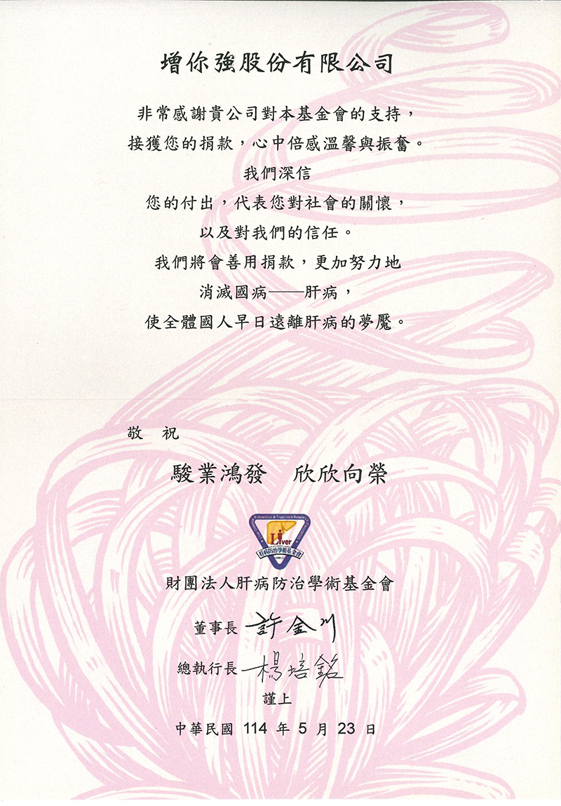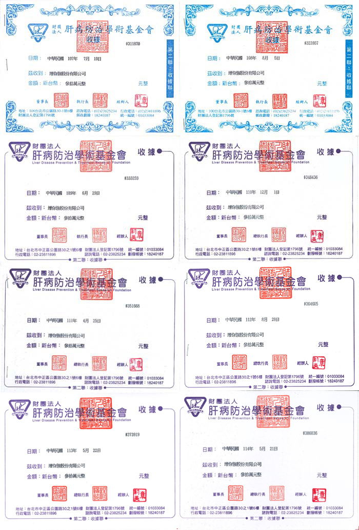 - 2018-2024年 每年捐贈財團法人肝病防治學術基金會30萬元