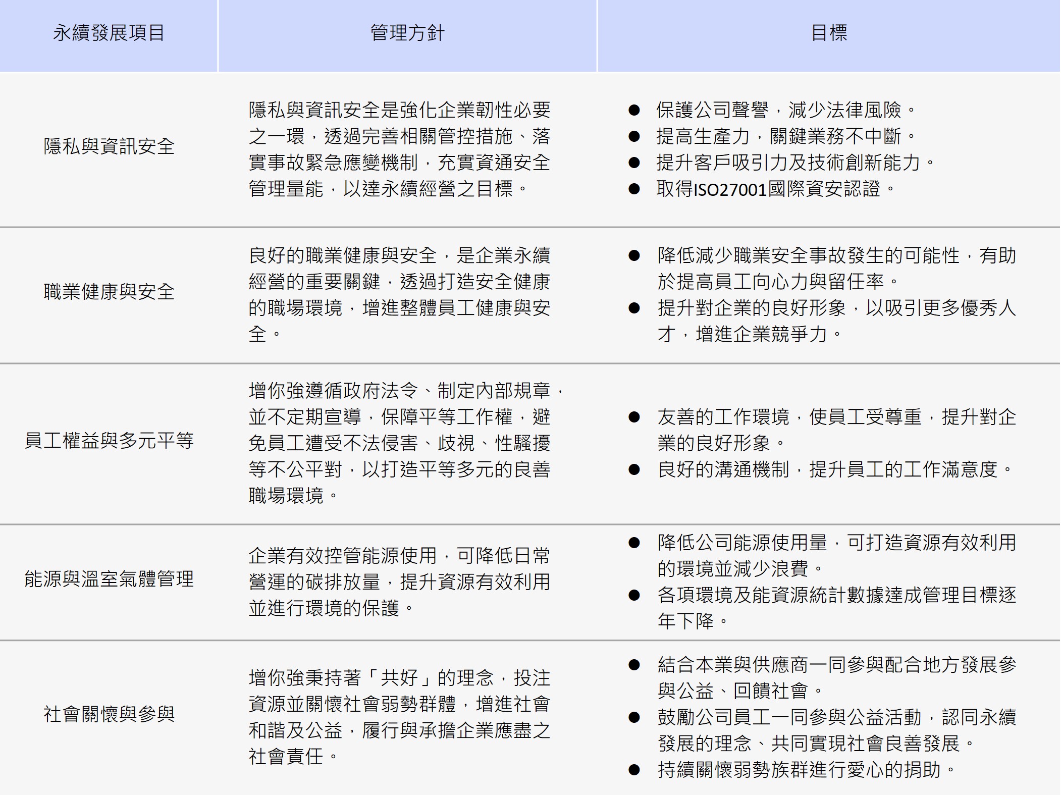 永續委員會作為公司內部永續發展推動的跨部門合作平台,由跨領域及專業的多位高階主管擔任委員,帶領上述各工作小組積極強化與利害關係人溝通,掌握關鍵議題,以研擬因應策略與工作方針,規劃各小組任務目標,並就執行情形進行檢視,確保推動策略與公司日常營運活動充分結合。