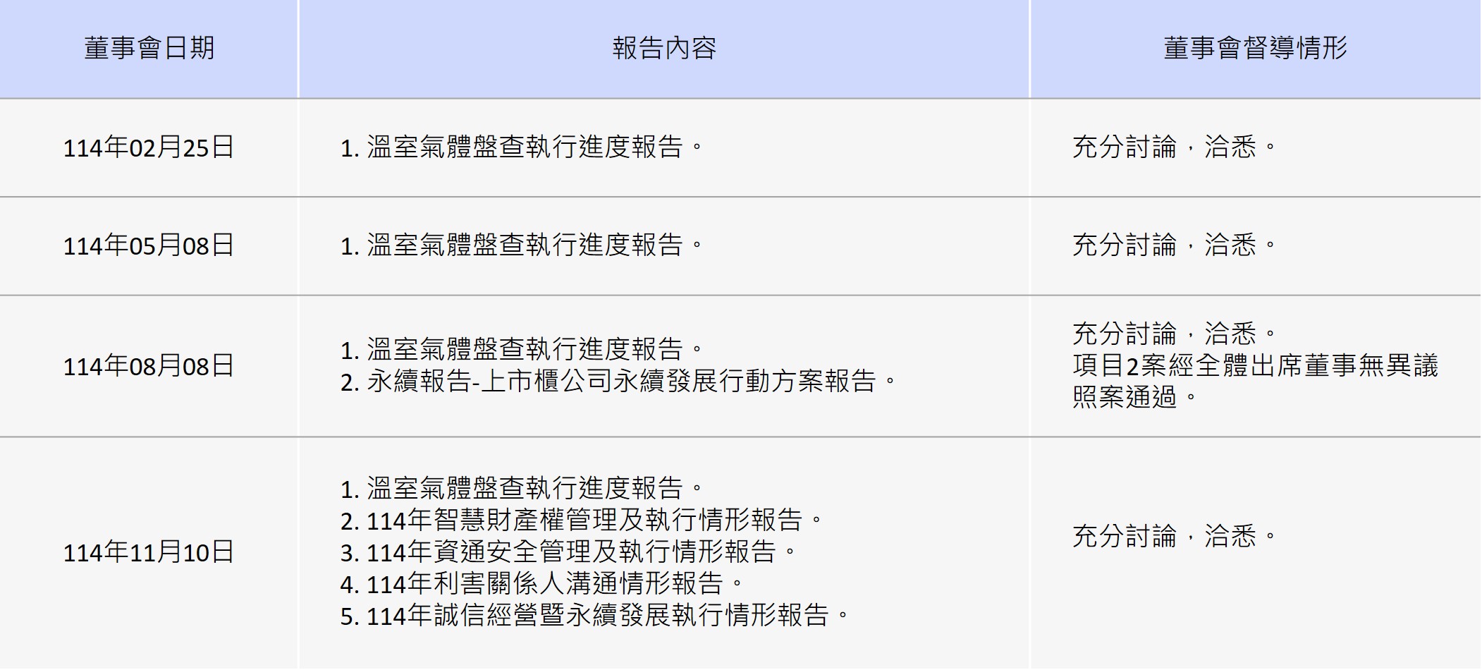 「永續發展委員會」一年至少一次向董事會報告執行成果及未來工作計劃,董事會依所提資訊進行評估與檢視,並在必要時敦促經營團隊進行調整。