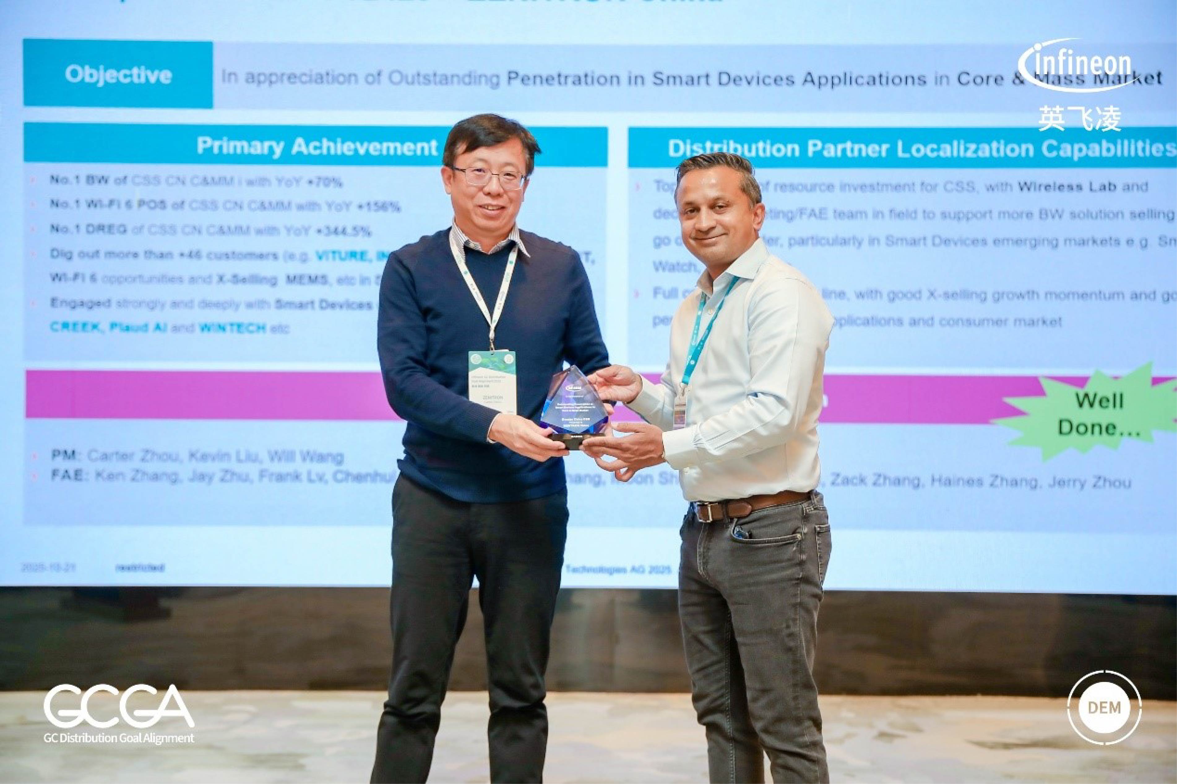 作為英飛凌大中華區的重要合作夥伴,增你強持續推廣 Smart Devices 相關產品與解決方案,憑藉專業的 Cross-Selling 能力與穩定的 FAE 團隊,成功拓展多元應用場景,並為客戶提供高效且專業的技術支持。此獎項象徵英飛凌對增你強在智慧裝置市場持續貢獻的高度肯定,也再次印證在合作價值與市場引領上的卓越地位。