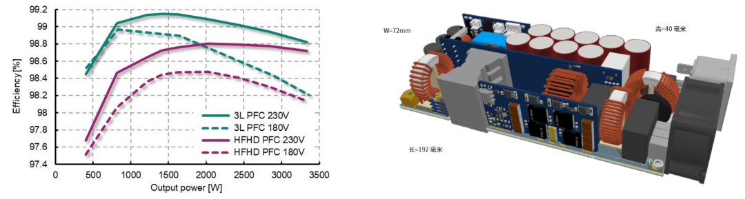 圖6. 採用25mΩ 400V SiC的3LFC-PFC和採用57mΩ 650V SiC的交錯圖騰柱(左)在230 VAC下的PFC測量效率,以及採用3LFC-PFC的3.3kW伺服器PSU的3D渲染圖(右)。