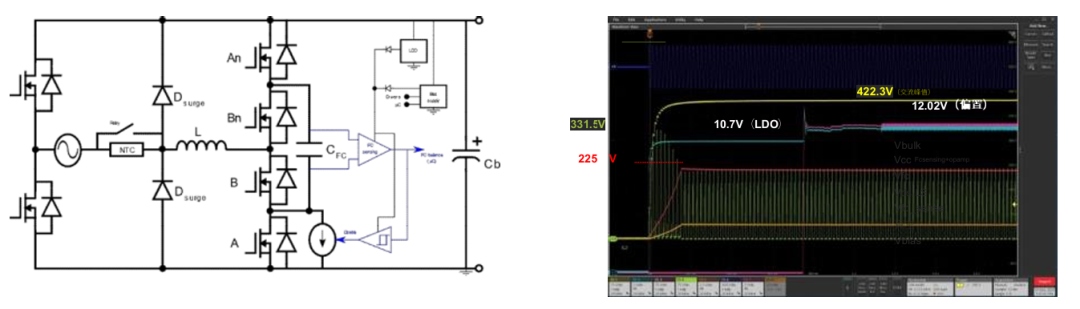圖7. 3L-PFC啟動(左)和300 VAC測試(右)的建議解決方案簡圖