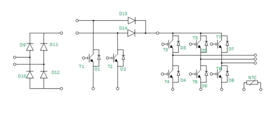 其中功率板採用EasyPIM™ 2B整合PIM模組FB50R07W2E3_B23,它帶雙通道交錯PFC級和三相逆變橋,採用50A Highspeed5交錯PFC級,50A溝槽柵截止層IGBT 3,發射極受控Emcon3二極管的逆變電源板連接三