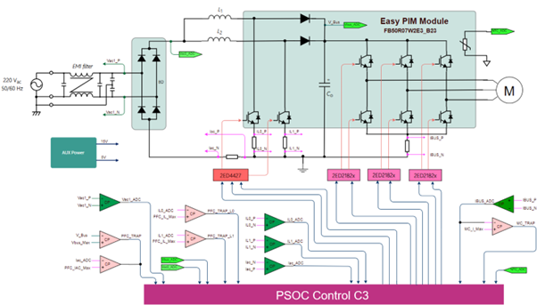 PSOC™ Control C3憑藉高主頻與高性能特性,可輕鬆控制40kHz交錯式PFC的開關頻率,降低電感值與體積,優化BOM成本。其內建獨特的馬達控制週邊設備,助力客戶簡化馬達控制開發(CORDIC加速器、DSP/FPU、TCPWM、12 Msps ADC)。