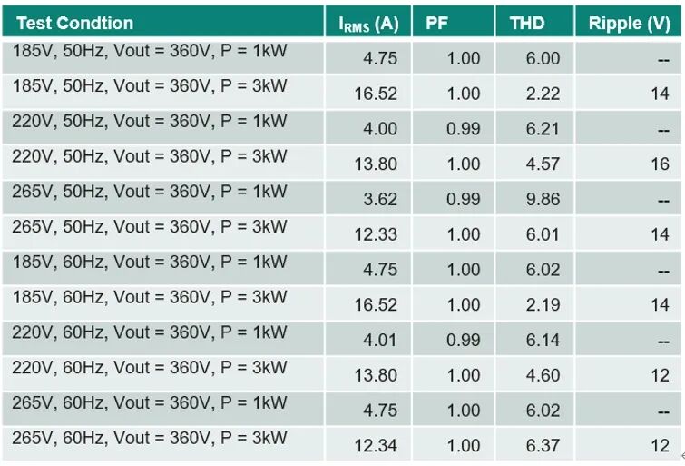 交錯並聯PFC+變頻解決方案由PSOC™ Control C3M5 Digital Power Control Card和4KW的功率板組成。交錯並聯式PFC PWM 的載頻在30kHz~40kHz,Peak efficiency: 97.4%,功率因數> 98%,總諧波失真<4.6%(滿載運轉時)。