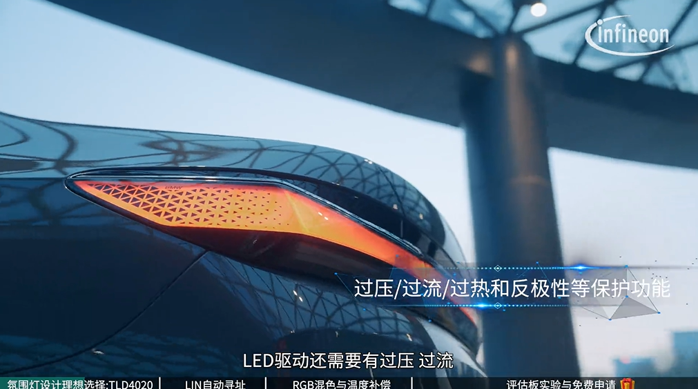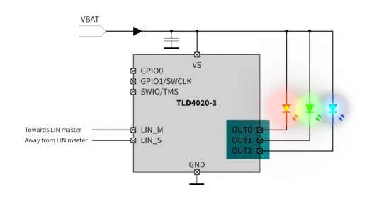 首先,TLD4020內部整合式LIN收發器,其自動尋址功能可精準定位每個RGB LED燈。