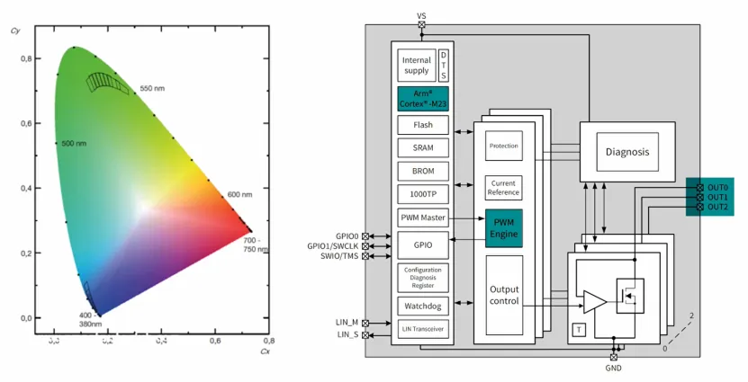 TLD4020的MCU核心支援這樣的演算法進行混色和座標轉換計算,計算出RGB三個亮度比,得到經過精確計算和調整 RGB LED 的 PWM 佔空比,晶片內部的3路16bit PWM Engine發生器,輸出3路PWM訊號控制RGB LED燈,就可以讓它們發出的光按照特定比例混合,從而得到所需的目標。