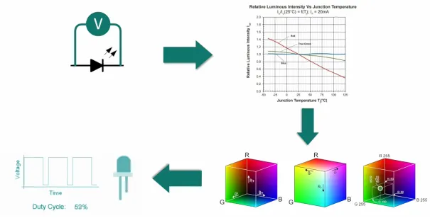 LED作為半導體,其長時間發光會帶來溫度的提升,而當溫度改變時,由於紅光、綠光、藍光LED 的發光效率變化不一致,特別是紅光的發光效率變化較大,會導致原本設定的顏色比例失衡,從而使混光後的顏色發生偏移。
