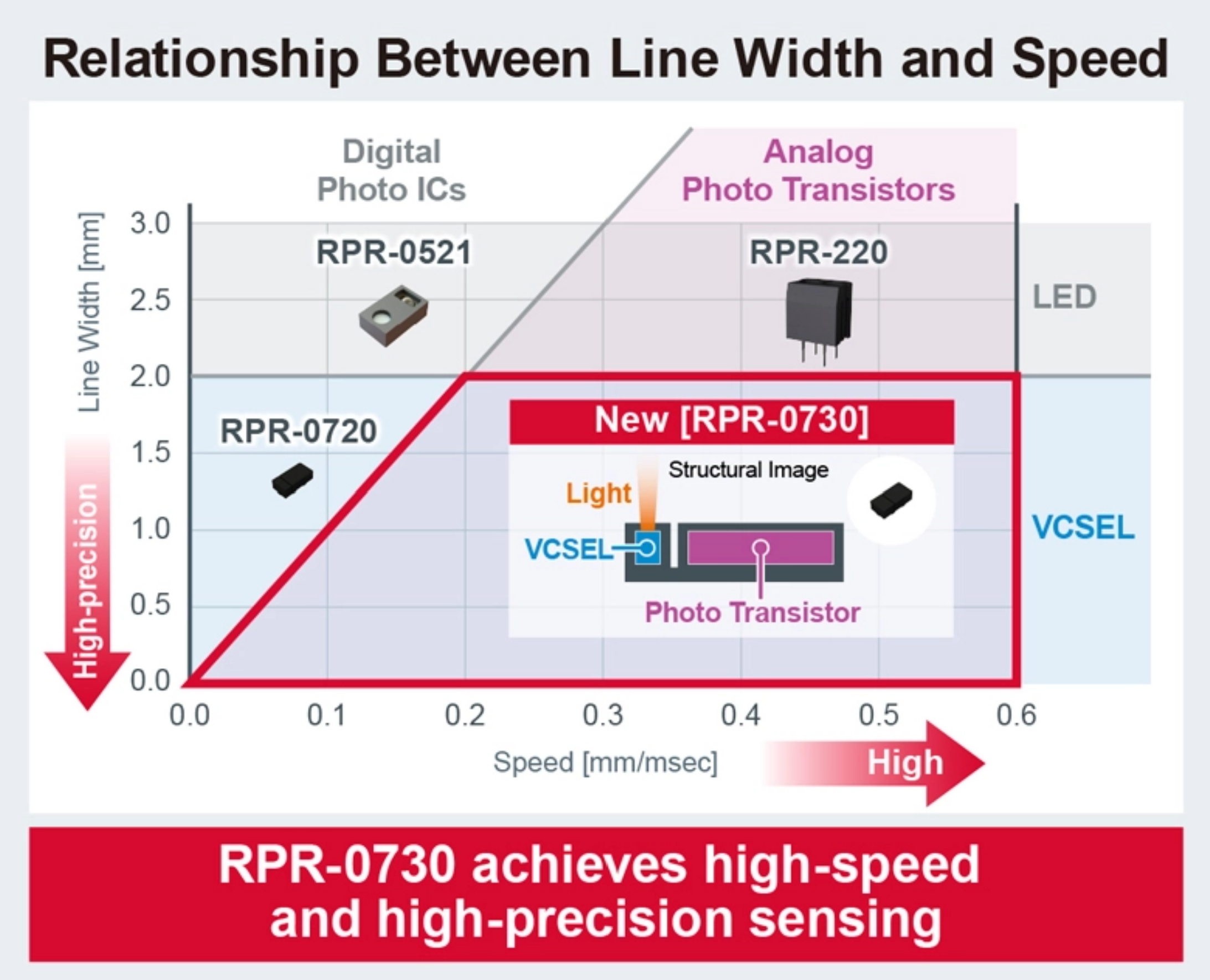 隨著工業設備和辦公設備的高性能、多功能及自動化發展,對感測技術的精度提升需求也隨之高漲,特別是標籤印表機、檢體搬送裝置和影印機等應用,除了透過製程優化等提升速度,亦需具備能夠更精準識別目標物的技術,因此導入高速且高精度的近接感測器變得至關重要。為應對上述需求,ROHM推出採用VCSEL作為發光元件、採用光電電晶體為受光元件的類比近接感測器「RPR-0730」。該產品能夠高速且高精度感測傳統LED光源難以識別的微細目標物。